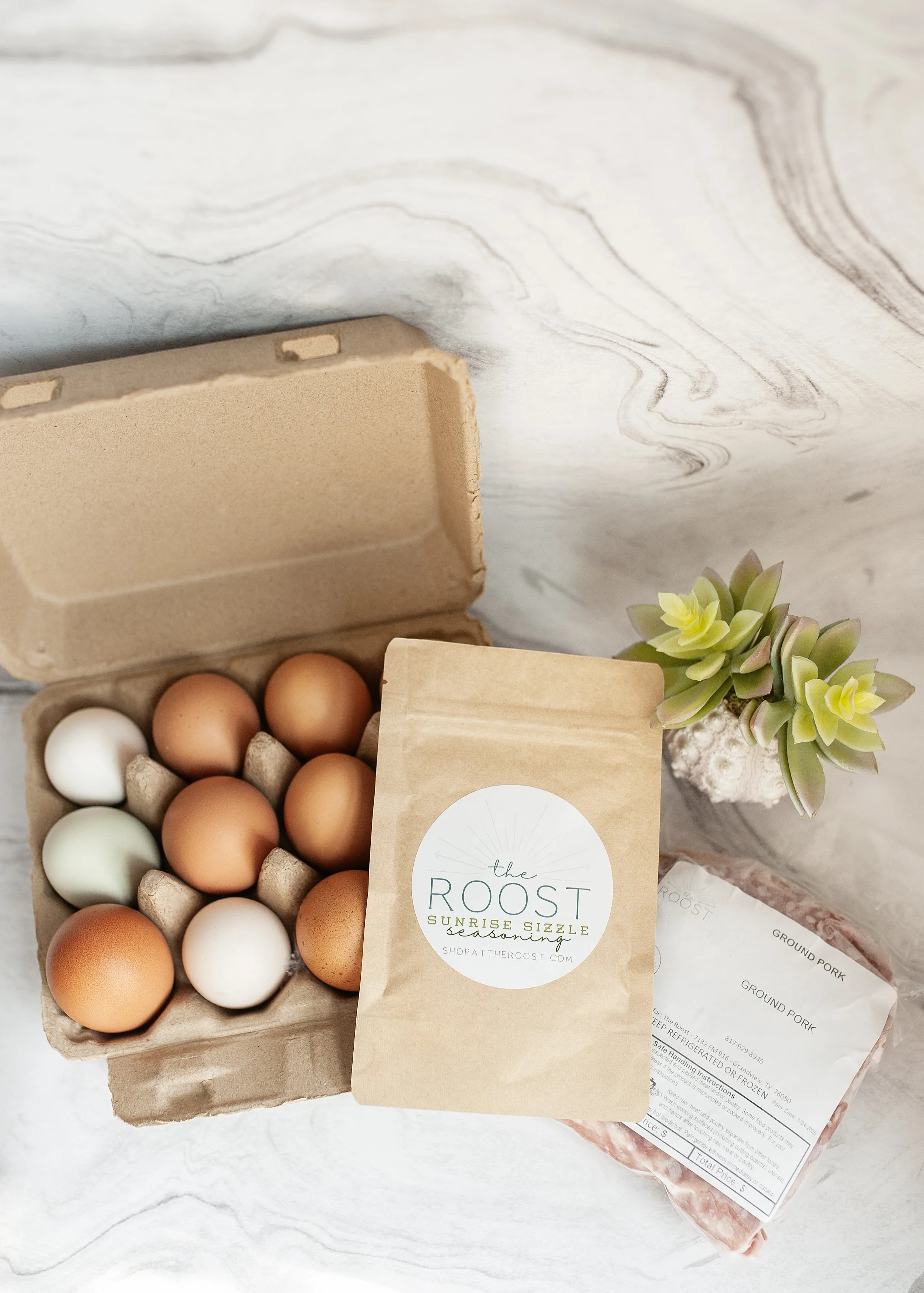 1 pound of pasture-raised ground pork, 1 dozen free-range eggs and 1 serving of small-batch artisan breakfast seasoning